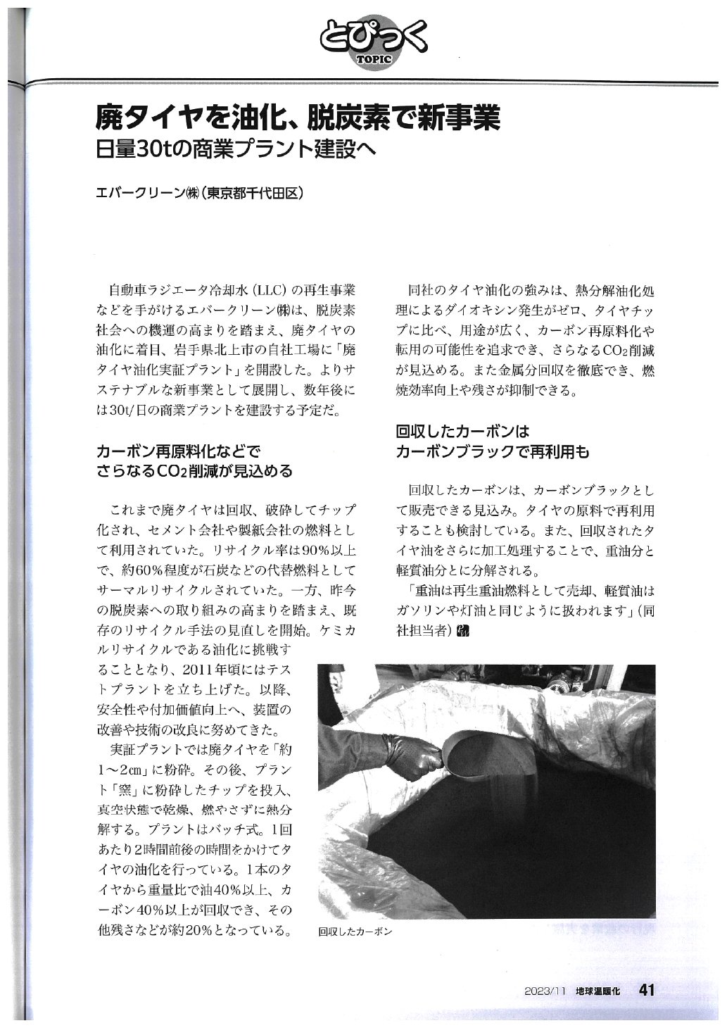 お知らせnews 日報ビジネス「地球温暖化」2023年11月号に掲載されました 2023年12月01日 お知らせ 弊社の廃タイヤ油化炭化処理プラントが掲載されました。 日報ビジネス 隔月刊誌「地球温暖化」 一覧ページに戻る